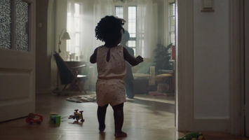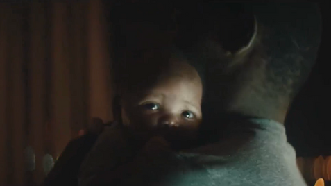 In the next scene in a low light bedroom, a dad is changing a smiling little one, dad plays with him and he responds even more excited throwing his favorite bunny on the floor. We see the toy falling, dad tries to get it back with his bare feet, so he won't leave the kid alone. It's a quite funny scene, baby laughs, it seems that he knows he was playing around with daddy.