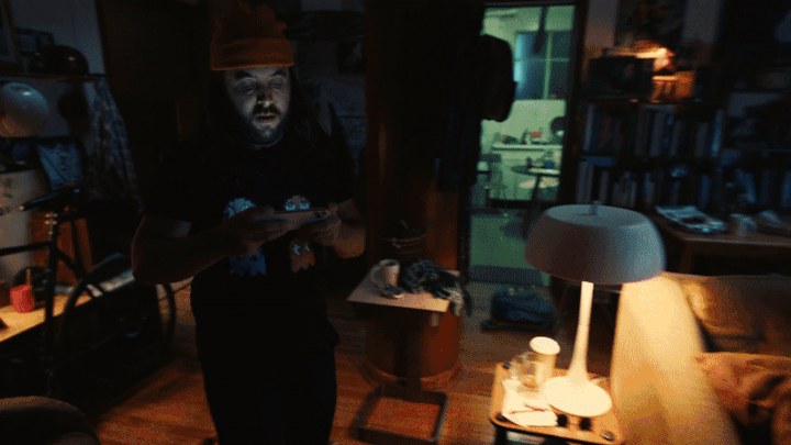 Agora cortamos para ele iluminado de azul e magenta concentrado em sua live stream. Ele joga com movimentos rápidos capturados em vários planos rápidos em hiphopcut que darão corte para nossa próxima sequencia de footages